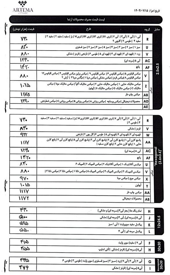 لیست قیمت کاشی استخری گلدیس قیمت نمایندگی اصلی